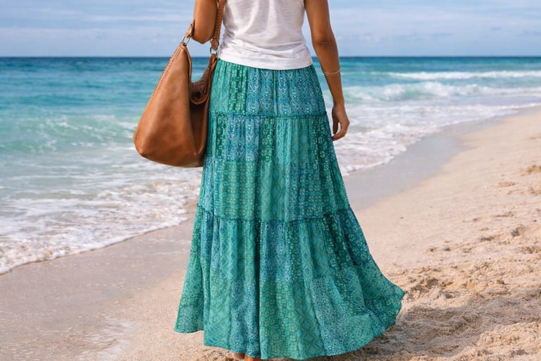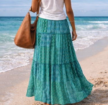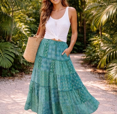 I picked up this boho maxi skirt in the green print and I’m not even kidding—it instantly gives that effortless “put together without trying” vibe. The colors are SO pretty in person. It’s like this mix of soft teal, green, and subtle vintage patterns that just scream summer. Not too loud, but definitely eye-catching in the best way.